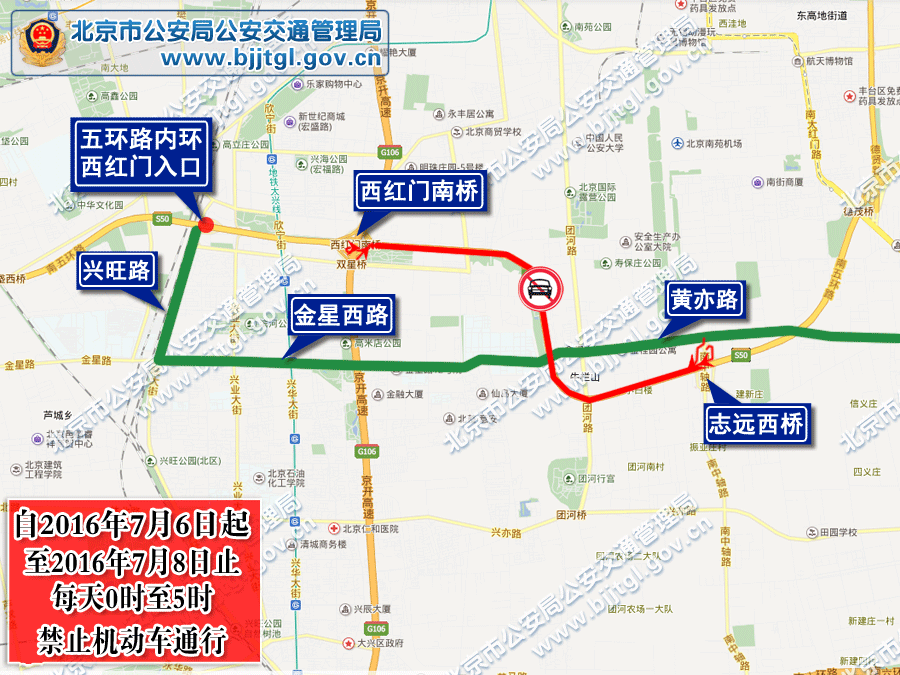 受此影響,7月6日至7月8日每天0時(shí)至5時(shí),五環(huán)路主路(西紅門南橋-志遠(yuǎn)西橋)段、京開(kāi)高速路西紅門南橋由南向東上五環(huán)路定向匝道、京開(kāi)高速路由北向東上五環(huán)路定向匝道、南中軸路志遠(yuǎn)西橋由南向西定向匝道、南中軸路志遠(yuǎn)西橋由北向西定向匝道以及五環(huán)路(西紅門南橋-志遠(yuǎn)西橋)段內(nèi)環(huán)西紅門入口,禁止機(jī)動(dòng)車通行。