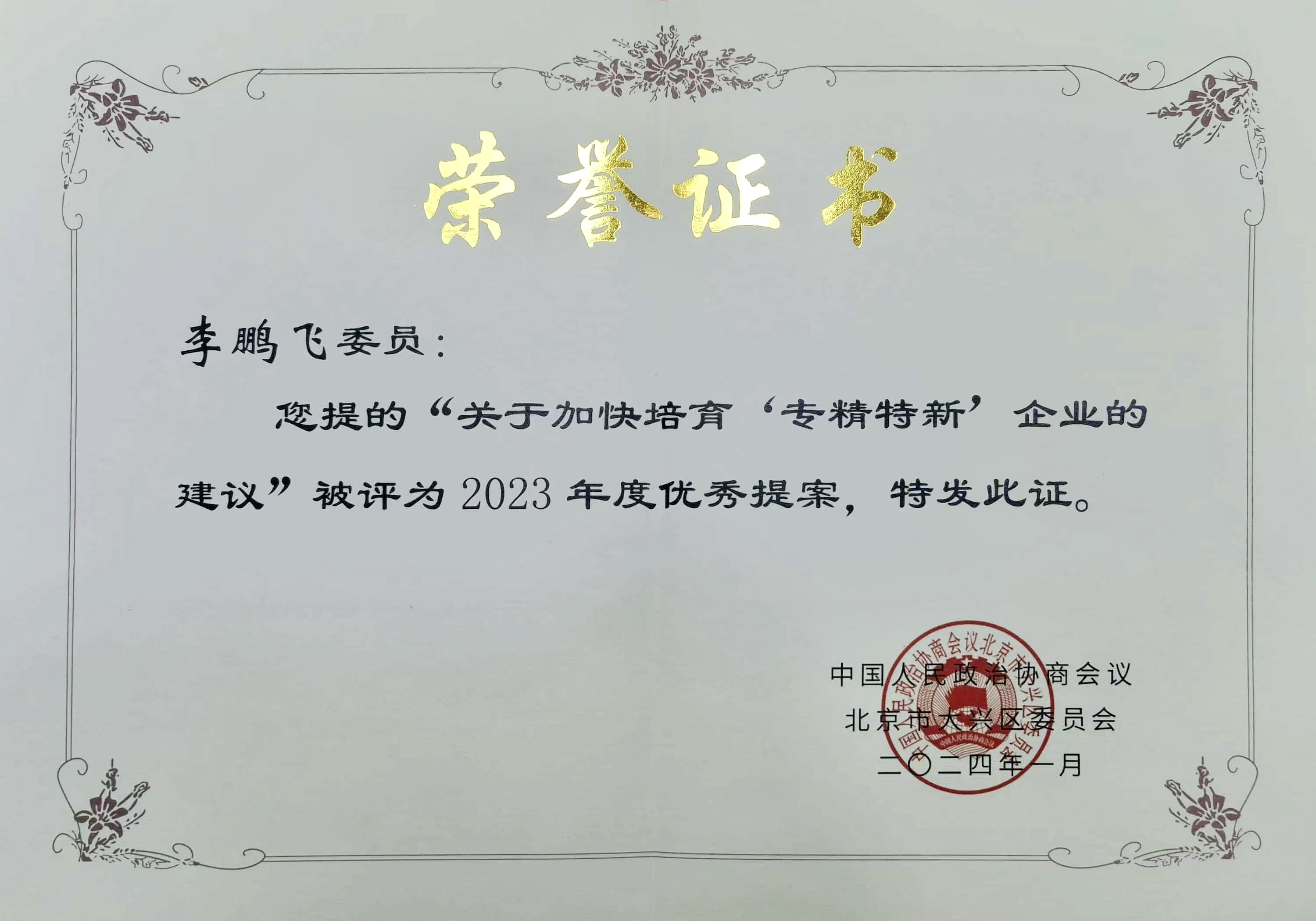 李鵬飛委員提出的“關于加快培育‘專精特新’企業(yè)的建議”被評為2023年度優(yōu)秀提案。